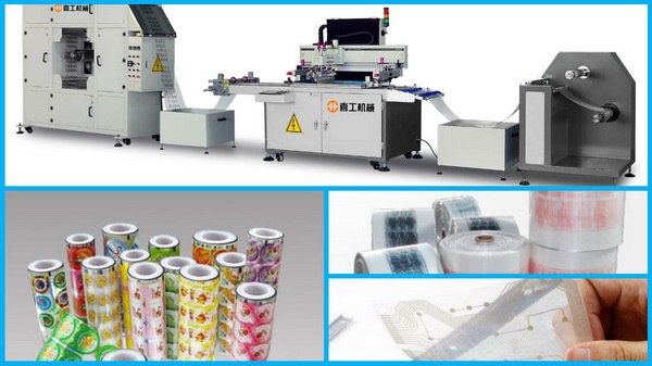 該機廣泛用于PET、PVC 、轉印紙(膜)、地暖膜、地熱膜、電熱膜、花紙、薄膜、銘板、柔性線路板、手機按鍵、3M膠、膠水、薄膜開關、商標鐳射、刮刮卡、不干膠標貼、桶裝紙、織帶、鋁箔、銅箔等卷筒材料的絲網印刷。